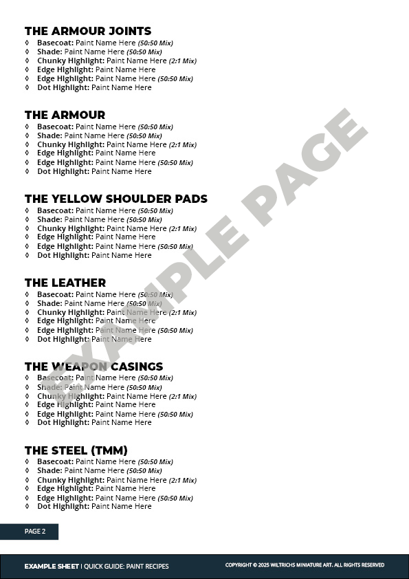 These recipe lists are not full painting tutorials, but they provide the exact paint recipes I've used on a project to help you save time and avoid guesswork. Whether you’re working on your first miniatures or batch painting an army, these guides help you maintain consistent, professional results every time.